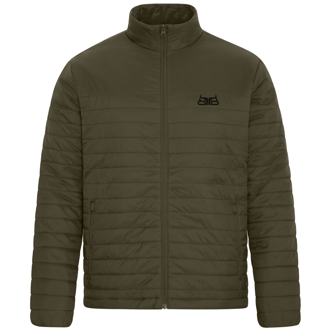 Stay warm without the bulk. This classic olive puffer features our logo embroidered on the...